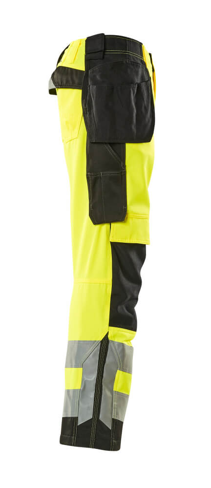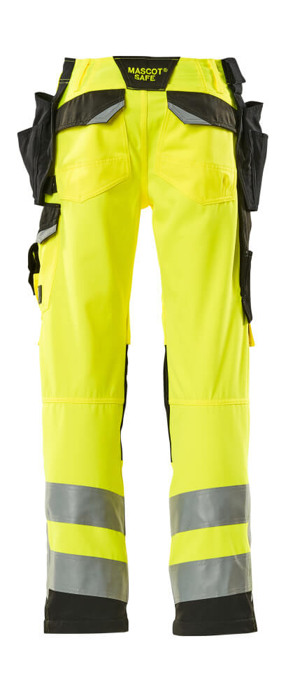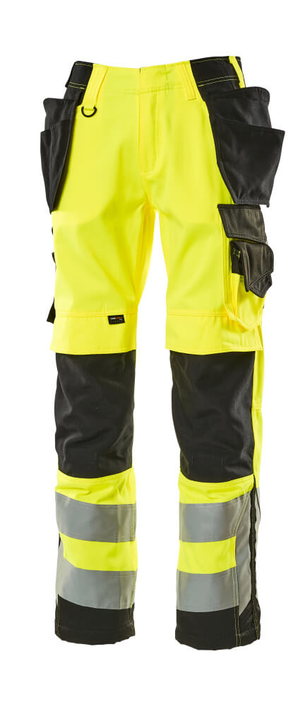 Kulutusta kestävä kolmoistikattu saumaus lahkeissa ja haaroissa pidentää tuotteen käyttöikää. Pintakäsittely tekee tuotteesta likaa hylkivän ja varmistaa hyvän näkyvyyden. Voidaan pidentää 3 cm kätevästi ratkomalla takaosan punaista tikkausta. Tumma kangas on sijoitettu sinne, missä vaate altistuu eniten lialle. Polvitaskut kulutuksenkestävää CORDURA®-materiaalia, joissa aukko polvipehmusteelle yläosassa - vetoketjukiinnitys läpän ulkopuolella, joten esim. ohjaimet pysyvät paikallaan. Tuote kestää teollista pesua. Sertifioitu yhteiskäyttöön MASCOT-polvipehmustetyypin SHORT tai LONG kanssa, sillä polvitaskun korkeutta voi säätää.